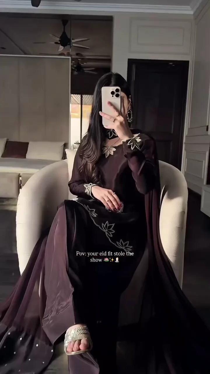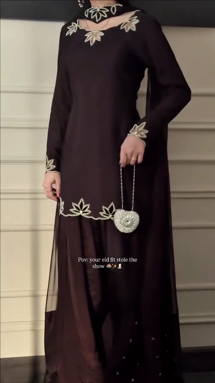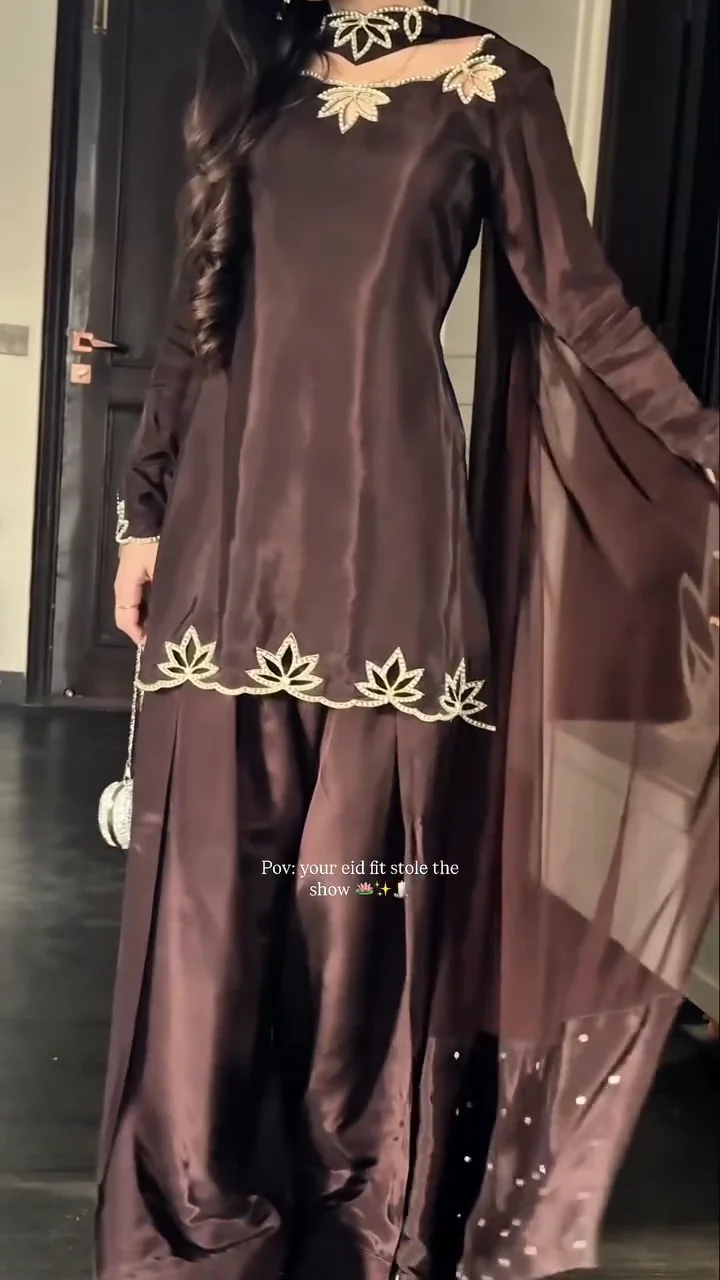 Crafted from smooth satin fabric, this chocolate brown suit exudes sophistication and festive glamour. The kurta is adorned with elegant gold leaf embroidery along the neckline and hem, adding a subtle statement to the design. It is paired with matching wide-leg trousers and a sheer dupatta that enhances the outfit’s graceful flow. Ideal for Eid celebrations, evening gatherings, and formal occasions.