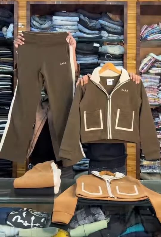 The image shows a person in a clothing store holding up a brown tracksuit set. The set includes a brown zip-up jacket with white piping details and matching brown pants. Below, another matching outfit is laid out on the counter. The background shelves are filled with folded jeans and other clothing items, indicating a retail apparel shop.