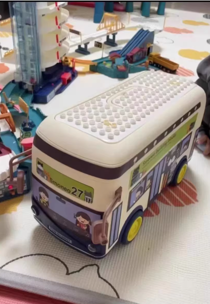 Designed in the shape of a colorful city bus, this playful toy doubles as a fun storage organizer. Featuring bright details, printed windows, and a grid-style top for placing small pieces, it sparks imagination while keeping toys neatly arranged. Perfect for kids who love vehicles, it adds both creativity and order to playtime.