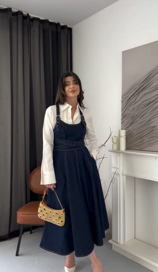 A sophisticated, city-chic ensemble featuring a dark-wash denim pinafore dress layered over a classic white shirt. The pinafore showcases a belted waist, thick shoulder straps with metallic buckle detailing, and a flared A-line silhouette that adds volume and movement. Paired with a crisp, tailored shirt featuring exaggerated cuffs, the look strikes a perfect balance between modern utility and vintage flair. Finished with white heels and a quirky mustard handbag for a trendy statement.