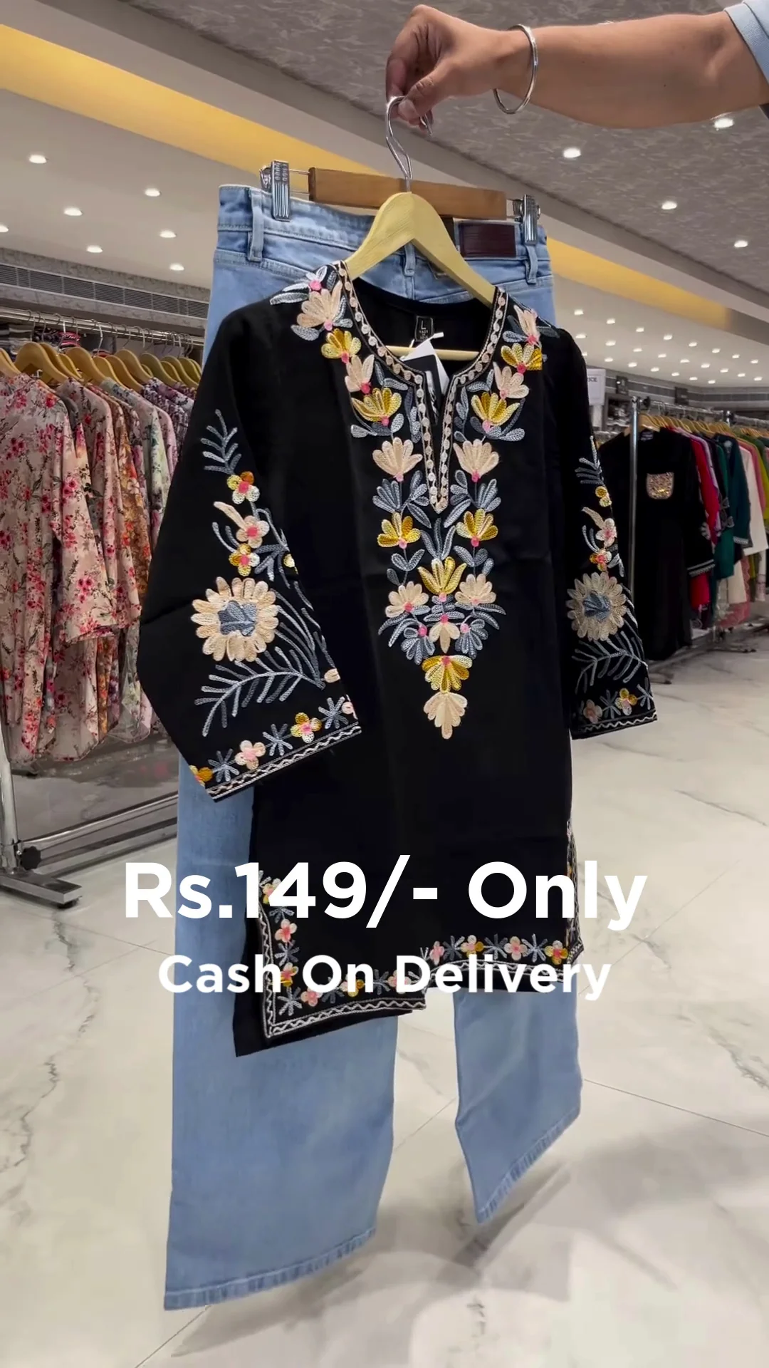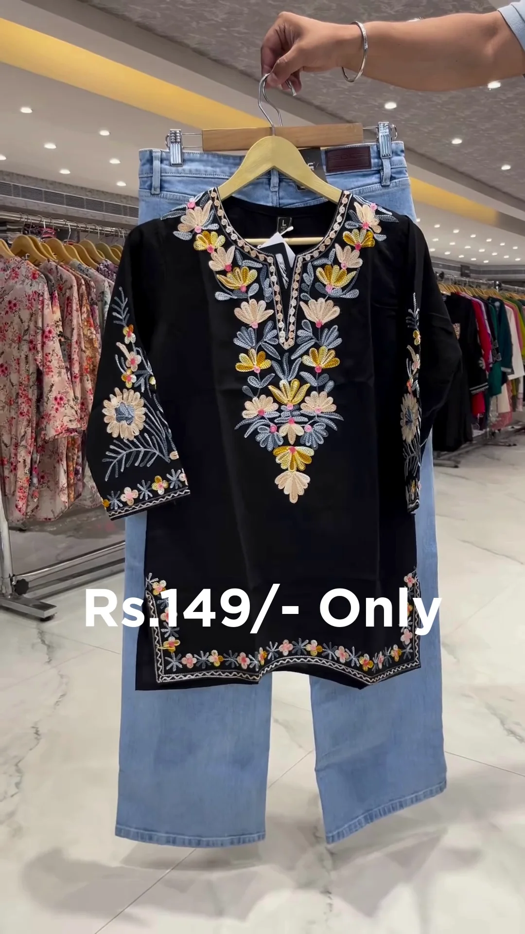 Step into effortless style with this stunning black embroidered kurti paired with classic denim jeans – a perfect blend of traditional charm and modern fashion. Designed for today’s fashion-forward women, this combo is ideal for casual outings, college wear, office looks, or festive gatherings where you want to keep it simple yet stylish. The black kurti stands out with its beautifully detailed multicolor floral embroidery on the front and sleeves. The intricate threadwork adds a vibrant and elegant touch, making the outfit look premium and eye-catching. The neckline is thoughtfully designed to enhance the overall appeal, giving it a graceful ethnic vibe while still keeping it versatile for everyday wear. The soft and breathable fabric ensures maximum comfort, allowing you to wear it all day without any hassle. Paired with light blue denim jeans, this combo creates a perfect fusion look. The jeans add a casual and trendy feel, balancing the richness of the embroidered kurti. The straight-fit denim offers comfort and ease of movement while maintaining a clean and stylish silhouette. Together, the outfit creates a chic Indo-western look that suits multiple occasions. This outfit is extremely easy to style. Pair it with flats or juttis for a traditional touch, or go with sneakers for a cool, casual vibe. Add minimal accessories like small earrings or a simple bracelet to complete the look without overpowering the outfit. You can also carry a sling bag or tote for a more polished appearance. Available at an unbeatable price of just ₹149, this combo offers incredible value for money without compromising on style or quality. It’s a must-have addition to your wardrobe if you love versatile outfits that can be worn anywhere, anytime. Upgrade your everyday fashion with this elegant yet affordable combo and make a stylish statement wherever you go