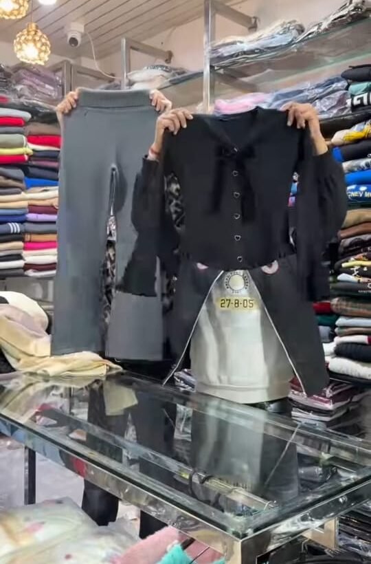 The image shows a person standing behind a glass counter in a clothing shop, holding up a black hoodie and gray pants. The background shelves are stacked with neatly folded clothes in various colors, suggesting a retail clothing store setting.