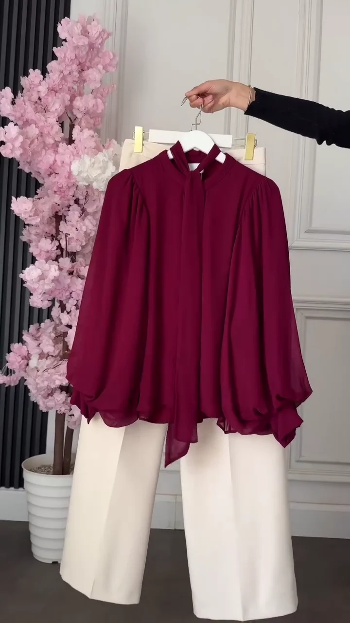 . This stylish co-ord set perfectly combines modern sophistication with timeless fashion. The navy blouse features a refined tie-neck detail that adds a graceful and feminine touch to the design. The soft gathered sleeves create a flowing silhouette that enhances comfort while adding stylish volume. The rich navy color contrasts beautifully with the cream wide-leg pants, creating a balanced and elegant