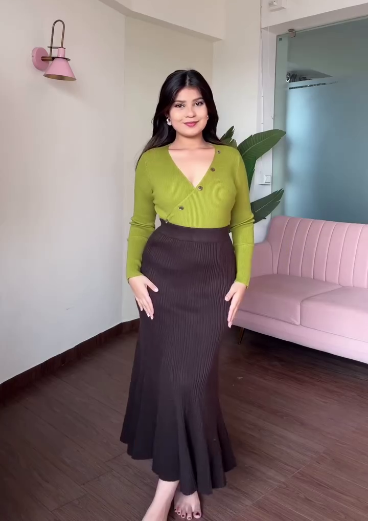 The outfit’s matching counterpart, the chocolate brown ribbed maxi skirt, enhances the overall silhouette with a sleek, body-flattering fit. Its high-waisted design elongates the figure, creating a smooth and elegant line from waist to hem. The ribbed texture adds dimension and structure, while the flared hem introduces graceful movement with every step. The rich brown shade perfectly balances the green top, resulting in a fashion-forward color palette that feels both modern and timeless. Whether styled with boots, heels, or flats, the skirt adapts effortlessly to various occasions and personal tastes.