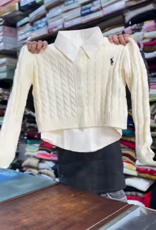 The image shows a person in a clothing store holding up a pink knit sweater layered over a light pink collared shirt. The sweater features a cable-knit pattern and a small embroidered logo on the chest. Behind, shelves are stacked with neatly folded clothes, indicating a retail clothing shop setting.